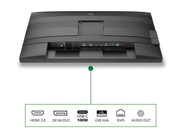 | Gränssnitt | HDMI (HDCP 1.4, HDCP 2.0) DisplayPort 1.4 (HDCP 1.4, HDCP 2.0) DisplayPort-utmatning LAN (RJ-45) USB-C 3,2 Gen 2 uppström (ström upp till 96W) USB-C 3,2 Gen 2 uppström (endast data) 3 x USB 3.2 Gen 2 nedströms (Typ A) USB 3.2 Gen 2 nedströms med batteriladdning 1.2 (snabbladdning) USB-C 3.2 Gen 2 nedströms (ström upp till 15 W) Linjeutgång för ljud (minijack) |
