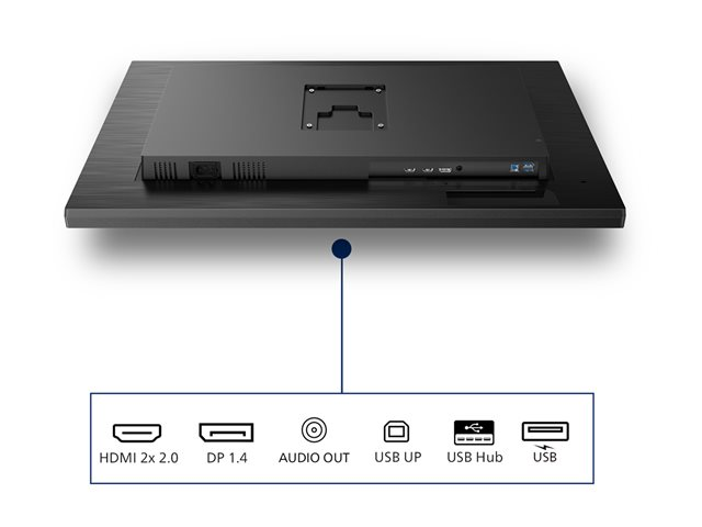 | Gränssnitt | DisplayPort 1.4 2 x HDMI Linjeutgång för ljud (minijack) USB 3.2 Gen 1 uppströms (Typ B) 3 x USB 3.2 Gen 1 nedströms (Typ A) 3 x USB 3.2 Gen 1 nedströms (snabbladdning BC 1.2) |