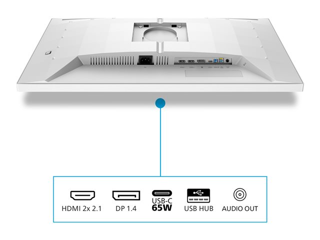 | Gränssnitt | 2 x HDMI (HDCP 1.4, HDCP 2.3) DisplayPort 1.4 (HDCP 1.4, HDCP 2.3) USB-C (HDCP 1.4, HDCP 2.2, DisplayPort altläge, ström upp till 65 W) Hörlurar (minijack) USB 3.2 Gen 1 uppströms (Typ B) USB 3.2 Gen 1 nedströms (Typ A) USB 3.2 Gen 1 nedströms (snabbladdning) |