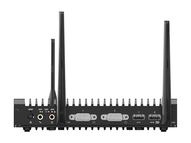 | Gränssnitt | 2 x USB 3.2 Gen 2 (2 fram) 1 x ljudutgång (1 fram) 1 x mikrofon (1 fram) 2 x seriell (RS-232/422/485) (2 fram) (RS232 / RS422 / RS485, BIOS valbar) 2 x USB 2.0 (2 bakre) 1 x HDMI (1 bakre) 1 x DisplayPort 1.4 (1 bakre) 2 x LAN (2.5Gigabit Ethernet) (2 bakre) 2 x Wi-Fi-antenn (2 bakre) |