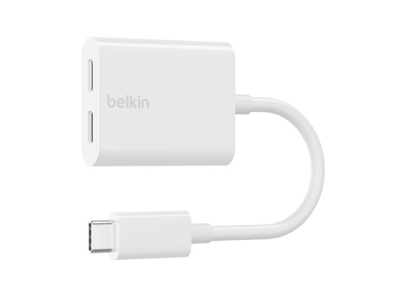 Belkin Connect Audio + Charge - USB-C till USB-C-hörlurar/laddningsadapter - 24 pin USB-C hane till 24 pin USB-C hona - 14 m - vit - USB Power Delivery (60W)