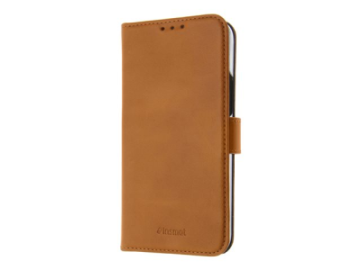 Insmat Exclusive Flip Case - Vikbart fodral för mobiltelefon - genuint läder, polykarbonat, bomullssömmar, kartong+papper - brun - för Apple iPhone 14 Pro