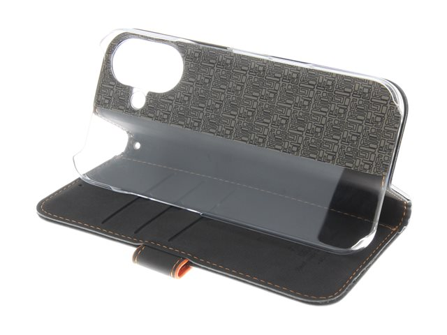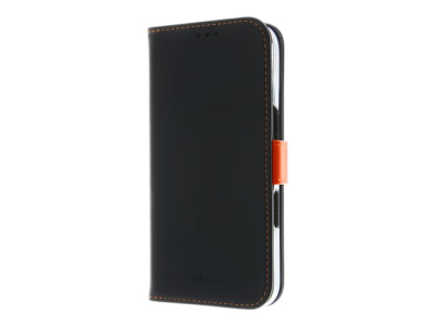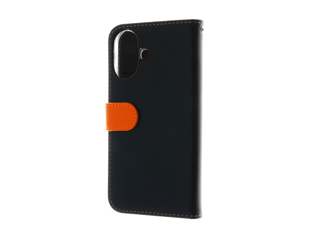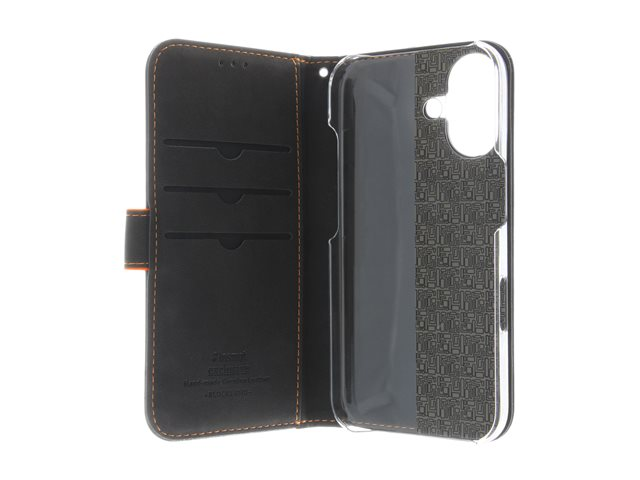 Insmat Exclusive - Vikbart fodral för mobiltelefon - genuint läder, kartong+papper+aluminiumfolie, polykarbonat (PC), bomullssömmar - svart/orange - för Apple iPhone 16