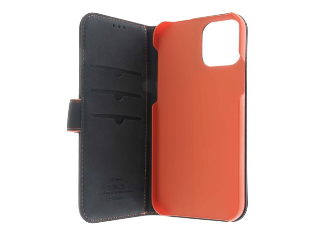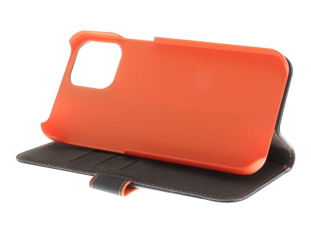 Insmat Exclusive - Vikbart fodral för mobiltelefon - läder, kartong+papper+aluminiumfolie - svart/orange - för Apple iPhone 11