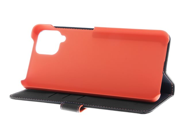 Insmat - Vikbart fodral för mobiltelefon - genuint läder, termoplastisk polyuretan (TPU), polyuretanklädsel - svart, orange, galvaniserad bronsring - för Samsung Galaxy A12