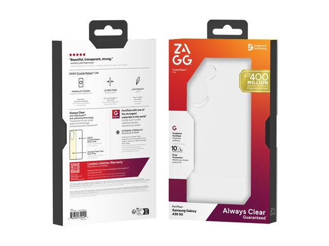 Crystal Palace Lite, designed for Samsung A56, is the slimmest, most lightweight, and crystal-clear case from ZAGG. Offering 10ft (3m) drop protection, it's tested to safeguard your phone from drops while maintaining a sleek profile. Infused with Graphene, the strongest material on Earth, it ensures exceptional durability. The ultra-thin design with slimmer side walls enhances your phone's natural color, while anti-yellowing properties keep the case crystal clear. Plus, it's fully compatible with most wireless chargers.