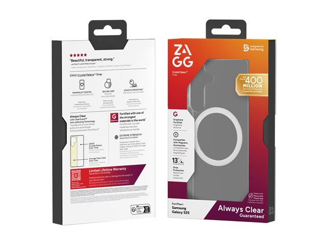 The Zagg Crystal Palace Snap offers robust protection for your cell phone with its protective cover design. Crafted from graphene, this back cover provides reliable scratch and yellowing protection and supports wireless charging, allowing for a seamless user experience. A non-slip grip ensures that your device stays securely in hand, even during daily activities, combining safety and functionality in one package. With a maximum drop protection height of 4 m, this case is designed to keep your smartphone safe from everyday mishaps while showcasing a commitment to sustainability, as it is made from 61% post-consumer recycled content.