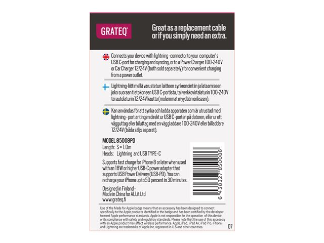 GRATEQ - Lightning-kabel - 24 pin USB-C hane till Lightning hane - 1 m - vit - Strömförsörjningsstöd