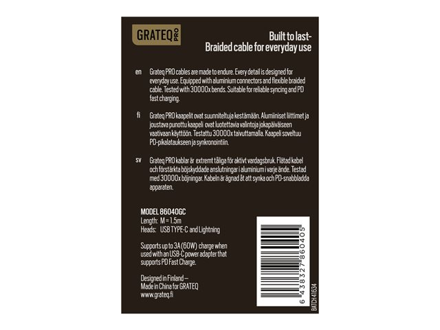 GRATEQ PRO - Lightning-kabel - 24 pin USB-C hane till Lightning hane - 1.5 m - vit - USB Power Delivery (60W), flätad kabel