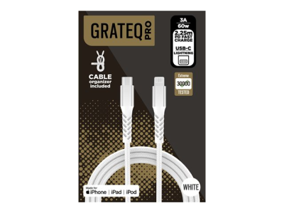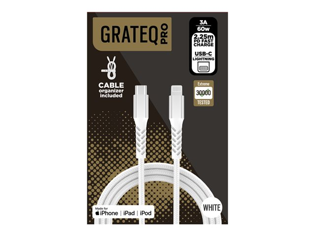 GRATEQ PRO - Lightning-kabel - 24 pin USB-C hane till Lightning hane - 2.25 m - vit - USB Power Delivery (60W), flätad kabel