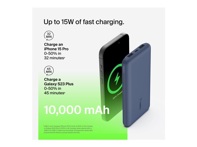 Belkin BoostCharge - Power bank - 10000 mAh - 18 Watt - 3 utdatakontakter (USB-C, 2 x USB) - blå BPB011BTBL