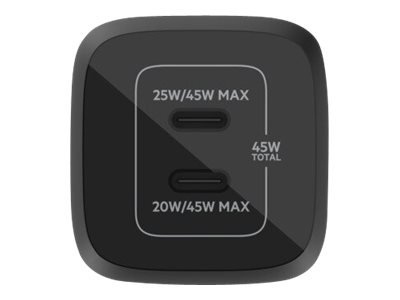 Belkin BoostCharge Pro - Strömadapter - PPS- och GaN-teknik - 45 Watt - 3 A - Fast Charge, PD 3.0 - 2 utdatakontakter (2 x USB-C) - svart