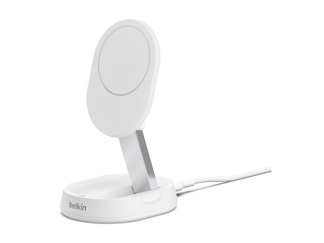 The Belkin BoostCharge Pro wireless charging stand is tailored for the modern cellular phone user, offering efficient wireless charging with its 15 watts of power. It features a convertible design for use as both a pad and a stand, suiting various charging needs. The stand ensures your device remains securely in place thanks to its magnetic fixation and non-slip base. Made from 60% recycled post-consumer plastic, the BoostCharge Pro is an eco-friendly choice that does not compromise on quality or performance. It complies with FCC, Qi, REACH, RoHS, and USB-IF standards, demonstrating its commitment to safety and high-quality standards.