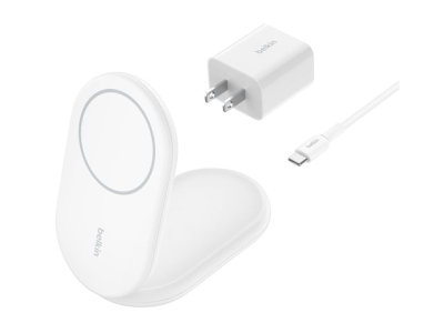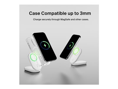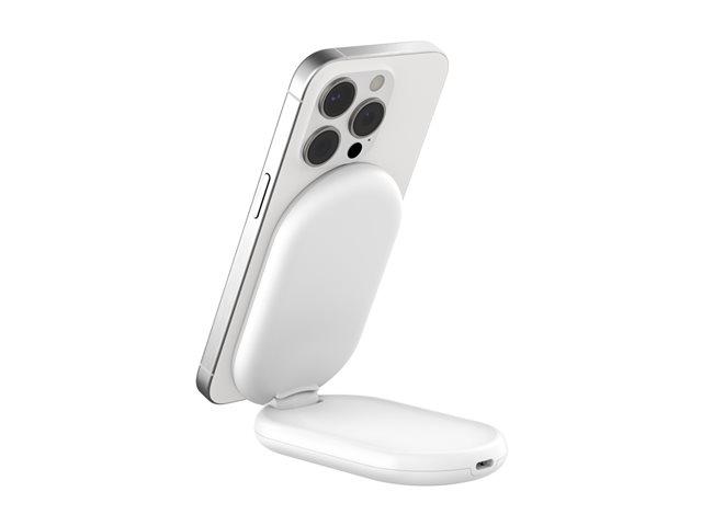 Belkin BoostCharge - Trådlöst laddställ - magnetisk, hopfällbar, med Qi2 + växelströmsadapter - 15 Watt - 3 A - Fast Charge, Strömmatning 3.1 - vit