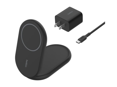 Belkin BoostCharge - Trådlöst laddställ - magnetisk, hopfällbar, med Qi2 + växelströmsadapter - 15 Watt - 3 A - Fast Charge, Strömmatning 3.1 - svart