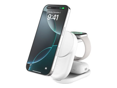 Belkin UltraCharge - Trådlöst laddställ - 3-i-1, magnetisk, vikbar, med Qi2 + växelströmsadapter - 25 Watt - Fast Charge - vit