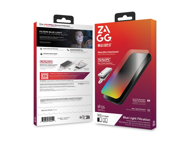 Glass Elite VisionGuard is made with ultra-strong tempered glass and has a blue light filter developed especially for people who spend a lot of time on their screens. And unlike other blue light solutions, Glass Elite VisionGuard won't tamper with the colors on your screen. Glass Elite VisionGuard is made with ultra-strong tempered glass, tested up to 5x stronger than typical, basic glass screen protection. In addition to providing tough impact and scratch protection, Glass Elite VisionGuard has a ClearPrint surface treatment that makes fingerprints virtually invisible when your screen is turned on. Glass Elite VisionGuard is made with up to 30% recycled glass. Installation is easy with ZAGG's new PerfectFit 2-step install system.