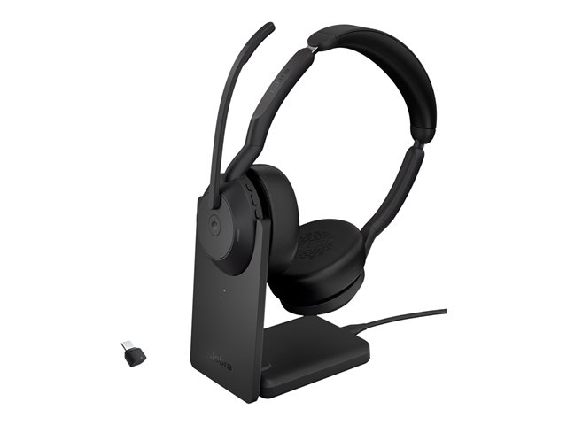 Jabra Evolve2 55 MS Stereo - Headset - på örat - Bluetooth - trådlös - aktiv brusradering - USB-C - svart - med laddningsställ - Optimerat för Microsoft Teams
