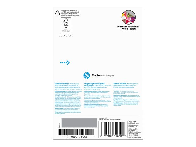 HP - Matt - 8,8 mil - 100 x 150 mm - 180 g/m² - 25 ark fotopapper - för Deskjet Ink Advantage 1275; Officejet 38XX, 46XX, 52XX, 57XX, 68XX, 69XX, 80XX, 8702, 9012 7HF70A