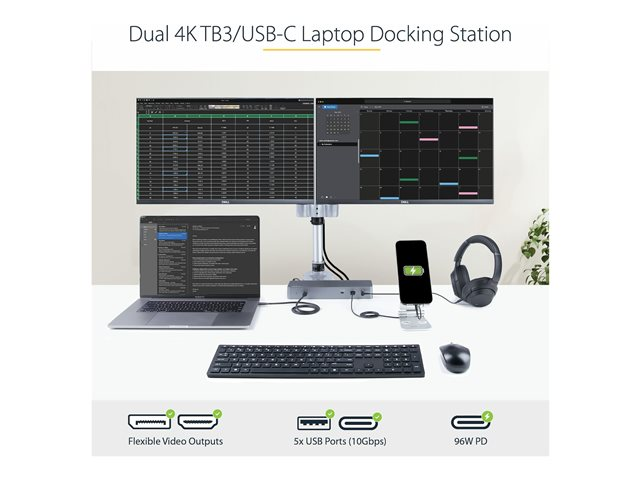 StarTech.com Thunderbolt 3-dockningsstation med USB-C värdkompabilitet - Dubbla 4K 60Hz DisplayPort 1.4- eller dubbla HDMI-skärmar - Singel 8K - TB3/USB-C dockningsstation för bärbar dator - 96 W PD, 5xUSB - 10 Gbit/s - dockningsstation - USB-C 3.2 Gen 2 / Thunderbolt 3 - 2 x HDMI, 2 x DP - 1GbE