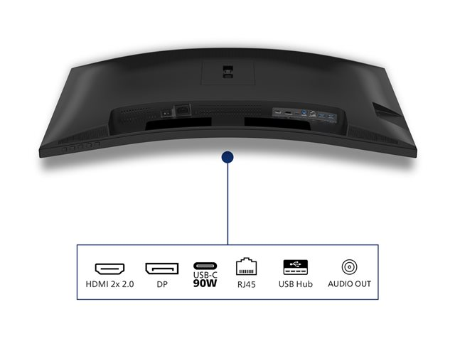 | Gränssnitt | DisplayPort 1.4 (HDCP 1.4, HDCP 2.2) HDMI (HDCP 1.4, HDCP 2.2) USB-C (ström upp till 90W) USB-B uppströms 3 x USB 3.2 Gen 1 nedströms (Typ A) USB 3.2 Gen 1 nedströms (snabbladdning BC 1.2) Linjeingång/utgång för ljud (minijack) LAN (RJ-45) |