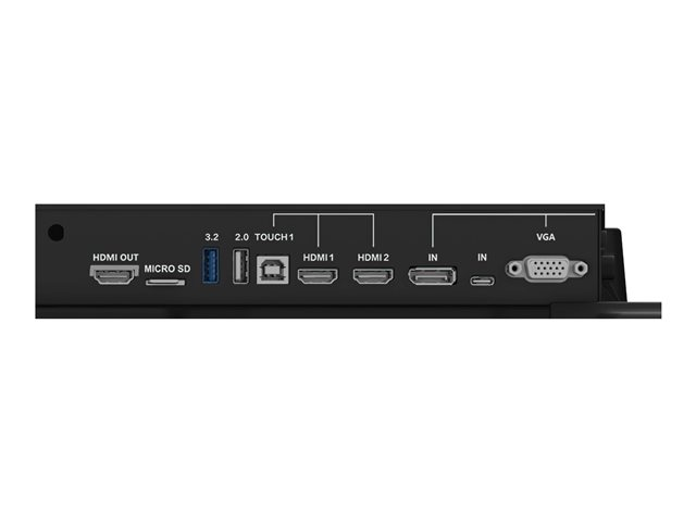 | Anslutningstyp | 2 x HDMI-ingång DisplayPort-inmatning HDMI-utgång Beröring USB-C 2.0 VGA-ingång Ljudingång Ljudutgång USB 2.0 (endast för programuppdatering) SPDIF-utgång 2 x Gigabit LAN RS-232C-ingång USB-C 3.2 Gen 1 med DisplayPort 1.2, pekskärm, 65W strömförsörjning USB 3.2 Gen 1 |