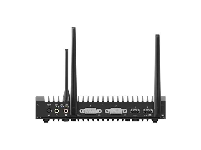 | Gränssnitt | 2 x USB 3.2 Gen 2 (2 fram) 1 x ljudutgång (1 fram) 1 x mikrofon (1 fram) 2 x seriell (RS-232/422/485) (2 fram) (RS232 / RS422 / RS485, BIOS valbar) 2 x USB 2.0 (2 bakre) 1 x HDMI (1 bakre) 1 x DisplayPort 1.4 (1 bakre) 2 x LAN (2.5Gigabit Ethernet) (2 bakre) 2 x Wi-Fi-antenn (2 bakre) |