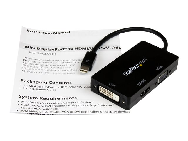 Startech A/V-reseadapter: 3-i-1 Mini DisplayPort till VGA-, DVI- eller HDMI-konverterare - Videokort - Mini DisplayPort hane till HD-15 (VGA), DVI-D, HDMI hona - 27 cm - svart - aktiv, 1920 x 1200 (WUXGA) stöd - för P/N: DKT31CMDPHPD