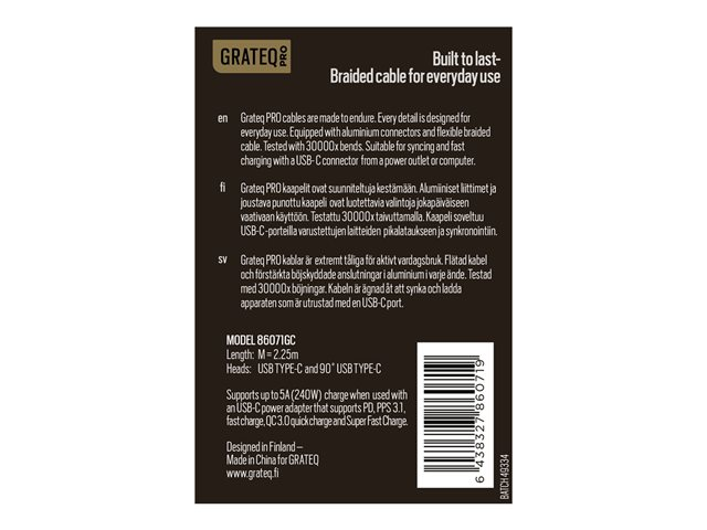 GRATEQ PRO - USB-kabel - USB-C (hane) till USB-C (hane) vinklad - 5 A - 2.25 m - USB-strömförsörjning (240W) - vit 86071GC