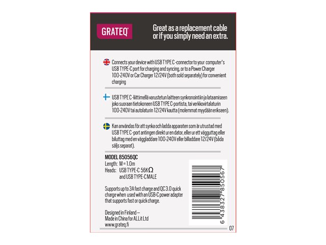 GRATEQ - USB-kabel - 24 pin USB-C (hane) till 24 pin USB-C (hane) - 5 A - 1 m - USB-strömförsörjning (100W) - vit 85056QC
