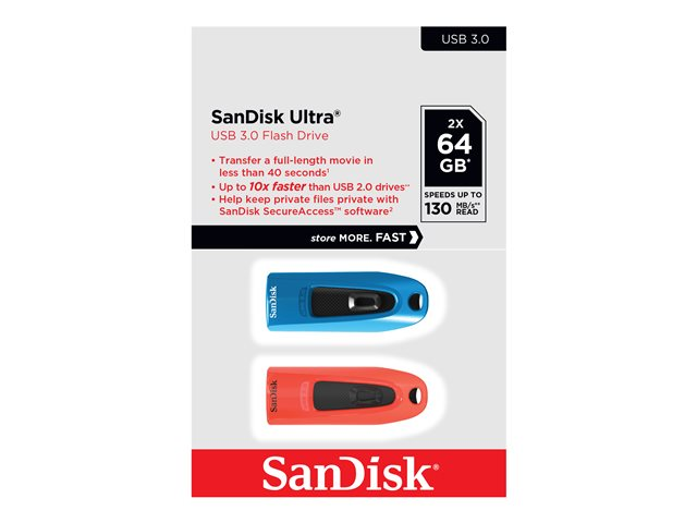 SanDisk Ultra - USB flash-enhet - 64 GB - USB 3.0 - blå, röd (paket om 2)