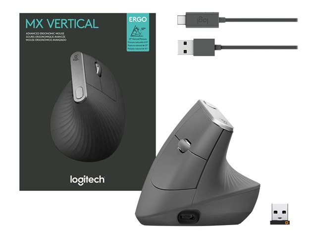 Logitech MX Vertical - Vertikal mus - ergonomisk - optisk - 6 knappar - trådlös, kabelansluten - Bluetooth, 2.4 GHz - trådlös USB-mottagare - grafit
