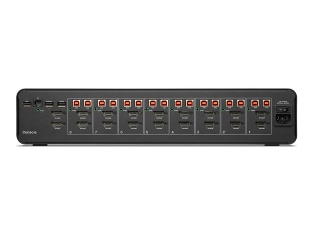 | Gränssnitt | 16 x DisplayPort/HDMI-ingång 2 x DisplayPort/HDMI-utgång 8 x tangentbord (USB)/mus (USB) Type B 1 x tangentbord (USB) Type A 1 x mus (USB) Type A 1 x ljudutmatning mini-jack 8 x ljudinmatning mini-jack 8 x USB 2.0 Type B common access card (CAC) 1 x USB 2.0 Type A common access card (CAC) 1 x hantering RJ-25 |