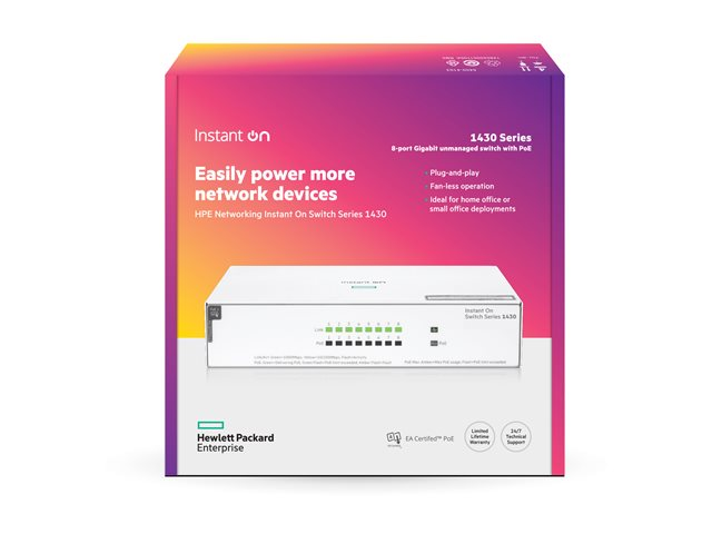 HPE Networking Instant On 1430 8G Class4 PoE 64W Switch - Switch - ohanterad - 8 x 10/100/1000 (PoE Class 4) - skrivbordsmodell, rackmonterbar, väggmonterbar - PoE (64 W) - BTO