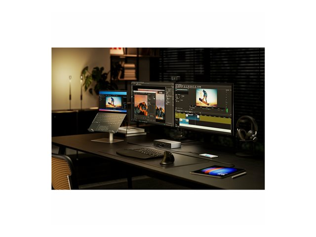 | Egenskaper | 100 % återvunnet aluminium, plats för säkerhetslås (kabellås säljs separat), Zero Footprint Mounting, DockWorks, upp till 140 W strömmatning |