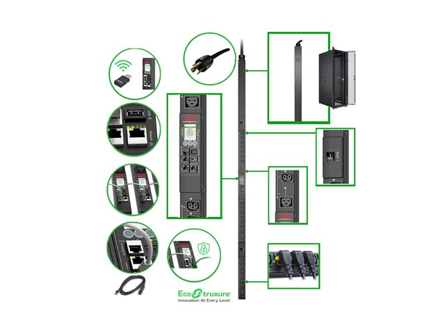 | Kontaktdetaljer för uteffekt | 21 x effekt IEC 60320 C13/C15 3 x effekt IEC 60320 C19/C21 |