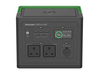 Schneider OffGrid 500 - Bärbar kraftstation - LCD, 2 BS1363-uttag, sinuskurva, 3 USB-A, 2 USB-C, trådlös laddare - AC 195 - 265 / DC 12 -30 V - 500 Watt - litiumjon - 517 Wh - utgångskontakter: 2 - Storbritannien - svart, grön
