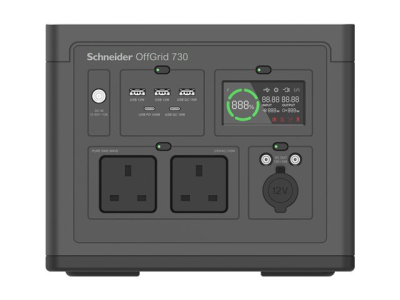 Schneider OffGrid 730 - Bärbar kraftstation - LCD, 2 BS1363-uttag, sinuskurva, 3 USB-A, 2 USB-C, trådlös laddare - AC 190 - 265 / DC 12 -30 V - 700 Watt - litiumjon - 738 Wh - utgångskontakter: 2 - Storbritannien - svart, grön