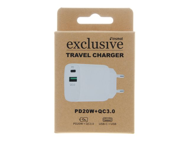 Insmat travel charger - Strömadapter - 20 Watt - 3 A - PD 3.0, QC 3.0 - 2 utdatakontakter (USB, USB-C) - för Apple 10.2-inch iPad (8:e generation); 10.9-inch iPad Air (4:e generation, 5:e generation)